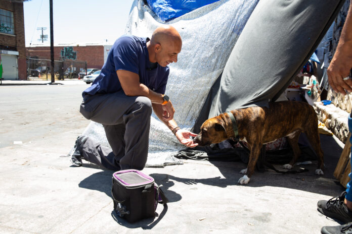 A moving experience outside of 7-11 about 13 years ago was my first encounter with an unhoused man and his dog. I approached them after noticing a severe skin condition from afar. I offered my help, all five minutes of my time, and $3 out of my pocket…then ran into the dog and man 12 days later, and she was transformed and happy. With tears in his eyes, the man just said thank you for not ignoring me. That was day one of ‘The Street Vet.’ My experience as a shelter vet certainly gave me a better understanding of the needs of those who love their animals but struggle to provide them with care.