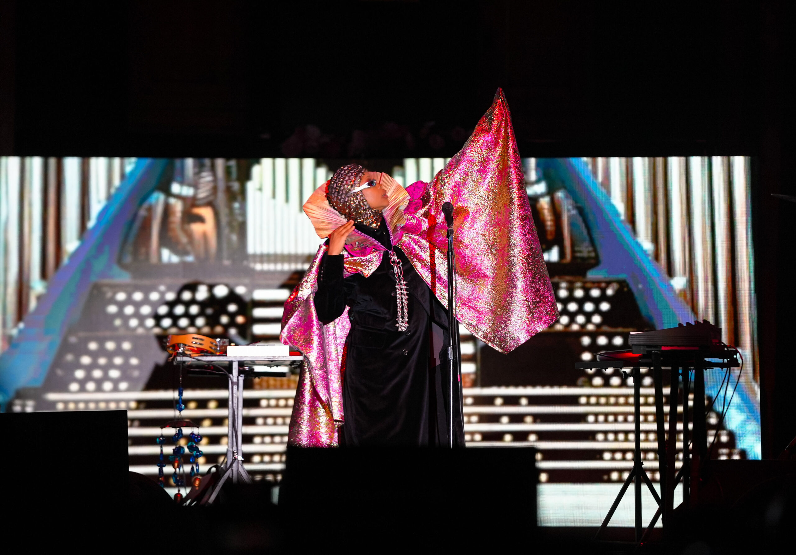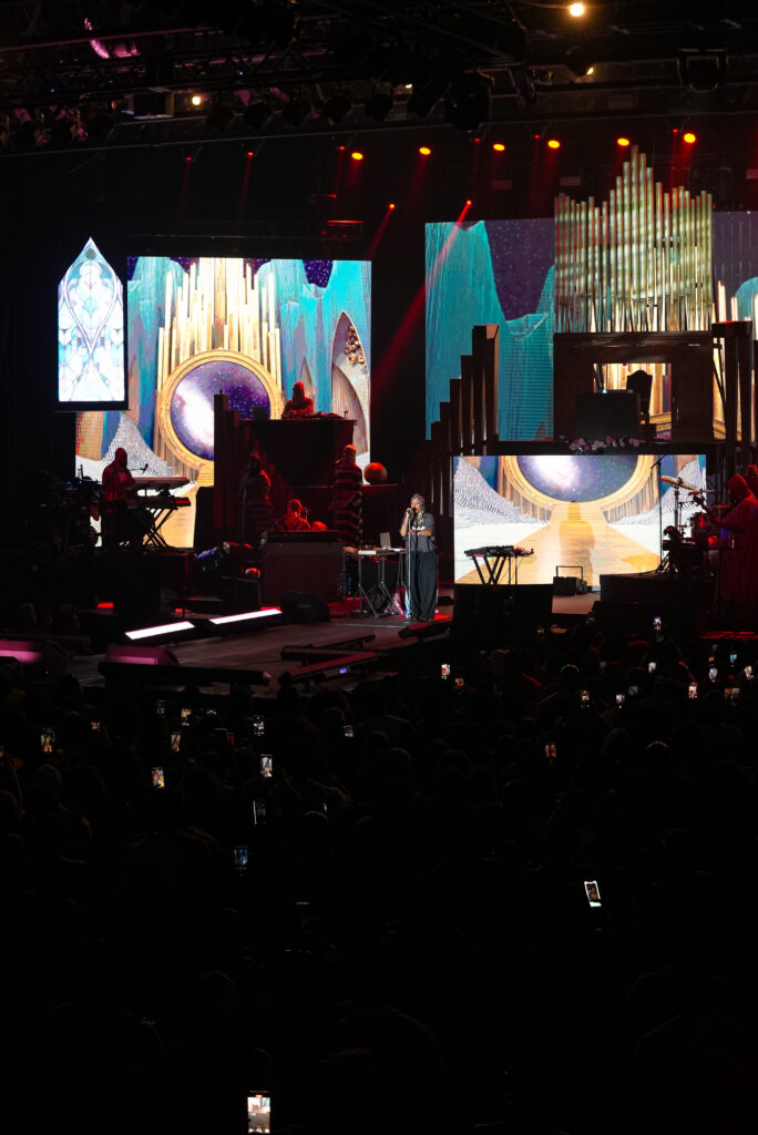 Draped in a pink gown, gold headpiece, and futuristic sunglasses, Badu stood atop organ pipes reminiscent of church altars. She floated through a set that included “The Healer,” “Apple Tree,” “On & On,” and “Window Seat.” At times, she stripped away layers—her gown, her grills, her headpiece—symbolically growing more open with each moment.