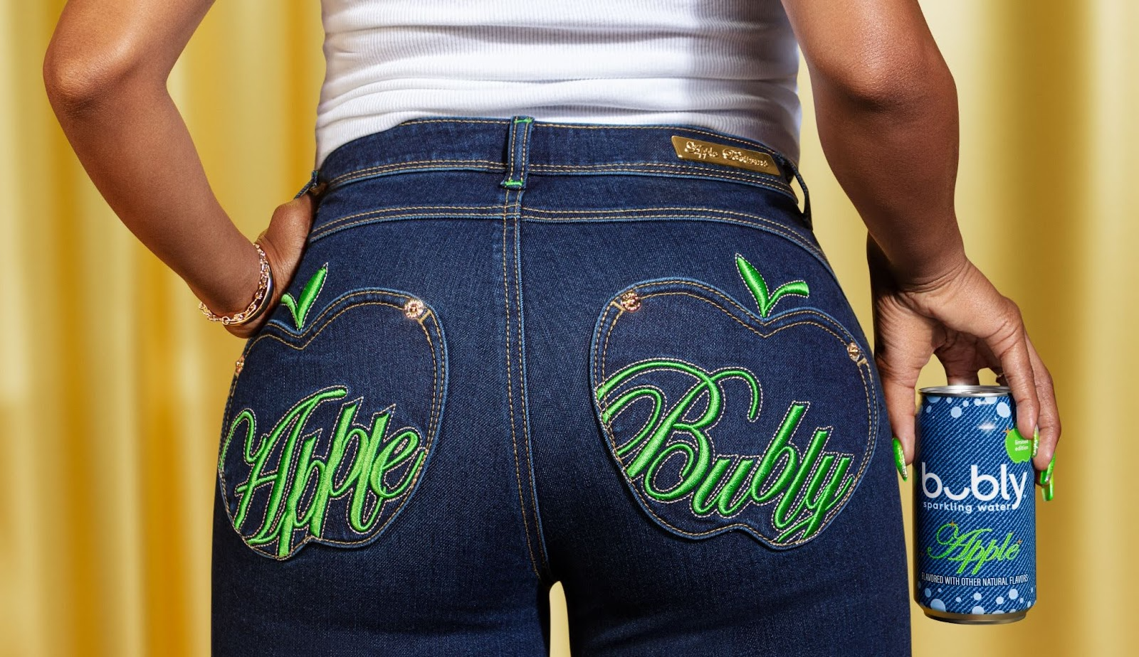 A delightful, unexpected collaboration with Bubly™ and Apple Bottoms by Nelly that quenches your thirst for Y2K nostalgia and fresh fashion. This fall, both powerhouses unite to launch “Apple Bubly Jeans” along with Bubly’s crisp apple flavor—for a limited time. The new denim release has the iconic apple-shaped pockets, bringing back the pop culture style of the 2000s. For the first time, they’ll be available in green with Apple Bubly stitched on the back pockets, designed to hold a can of Bubly™. A juicy collaboration for the fall season, these customized “Apple Bubly Jeans” by Apple Bottoms are available only on AppleBottoms.com.