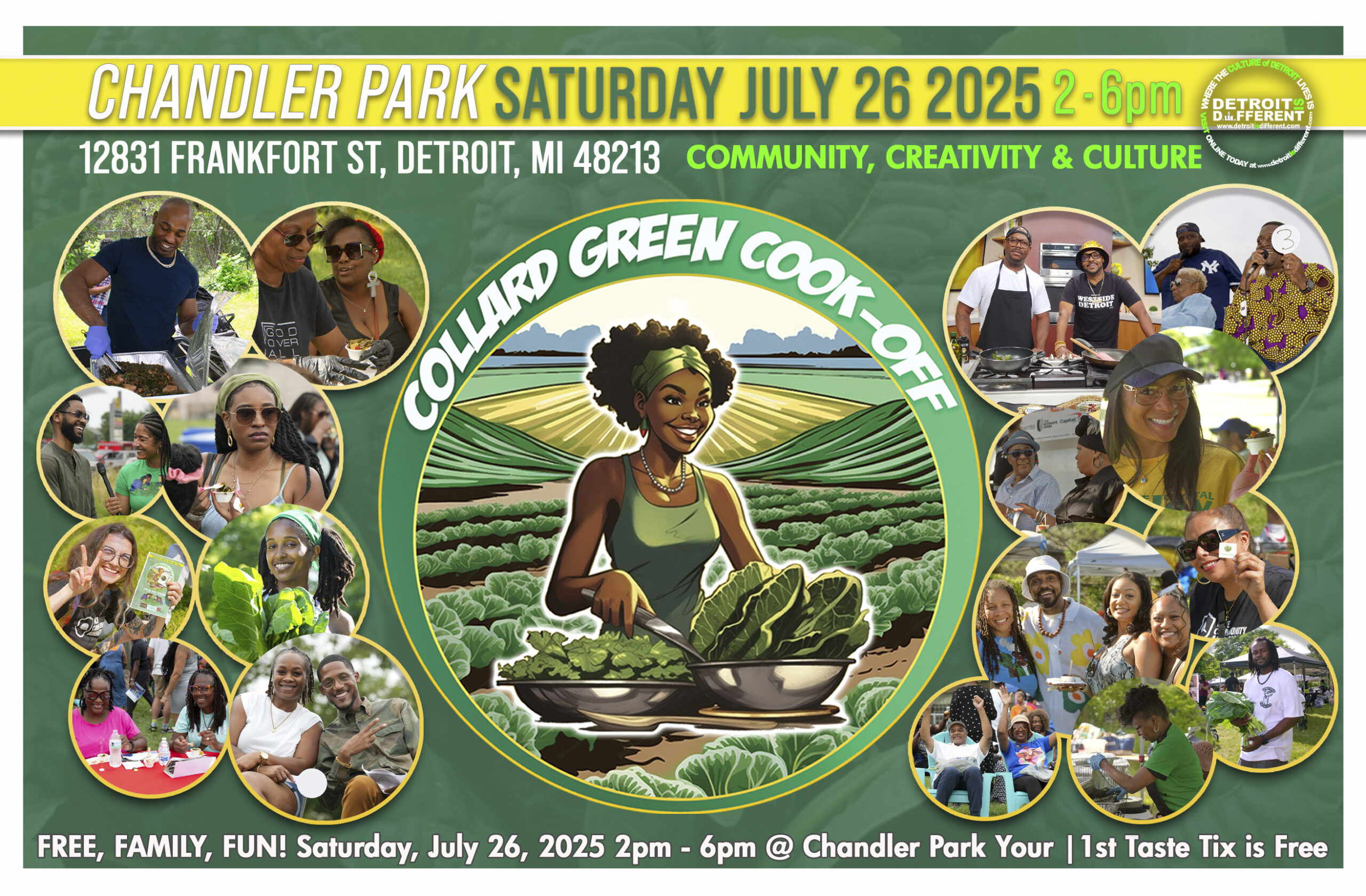 Detroit is Different Community Group announces the return of the 3rd Annual Collard Green Cook-Off, a soul-filled celebration of Black culinary heritage, taking place Saturday, July 26, 2025 from 2 – 6 p.m. at Chandler Park located at 12831 Frankfort St in Detroit.